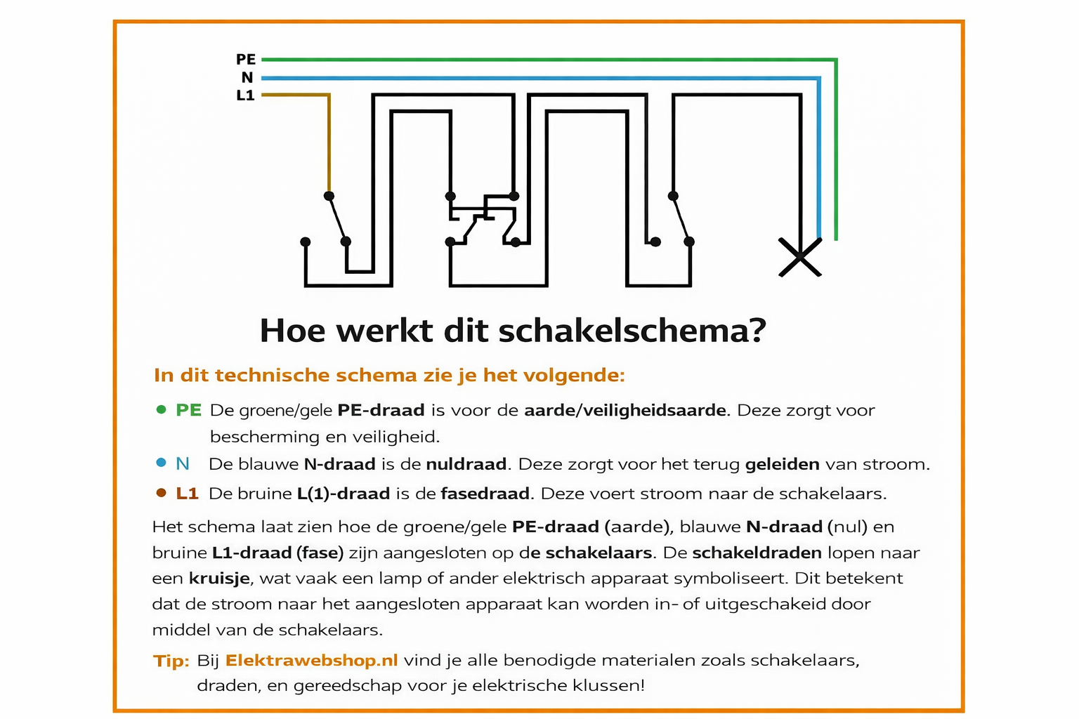 Daarna loopt de stroom via twee schakeldraden naar de kruisschakelaar.