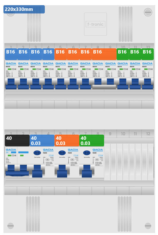 1 x Ledige groepenkast koppelbaar 2x12 modules, 1 x Lastschakelaar 2 polig 40A hoofdschakelaar, 12 x Installatieautomaat 1 polig + nul 16A karakteristiek B 6kA, 3 x 40A Aardlekschakelaar 2 polig 30mA.